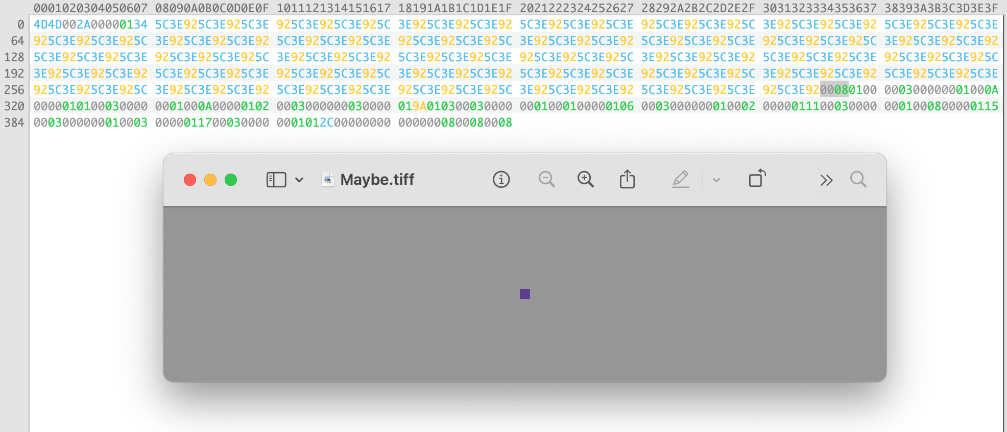 The very first TIFF I made that was readable was simply a small purple square. All of the values were specified directly in hex, the offsets manually calculated, with the most minimal scaffolding around to make an array of bytes.